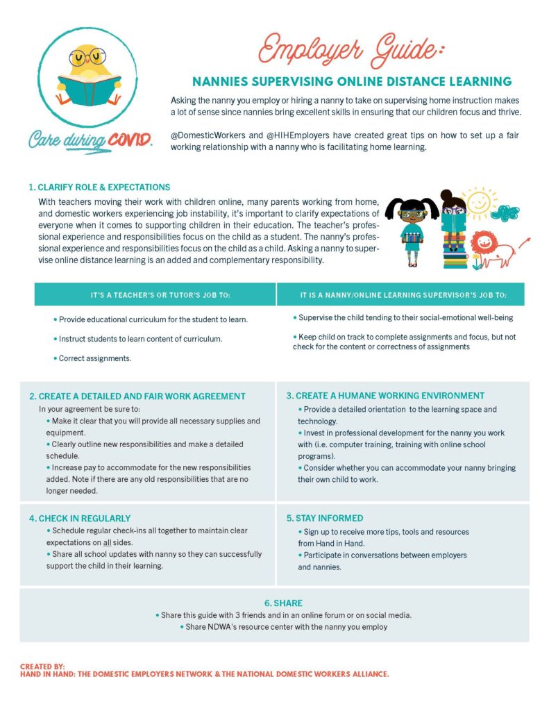 The National Domestic Workers Alliance and Hand in Hand: The Domestic Employers Network have developed an employer’s guide with input from nannies and domestic employers across the country to provide you with tips when having your nanny supervise online learning.